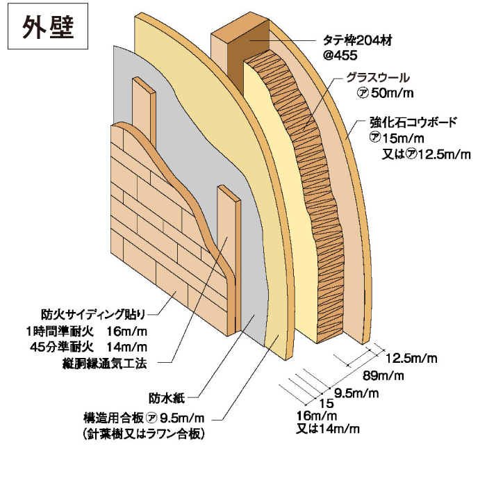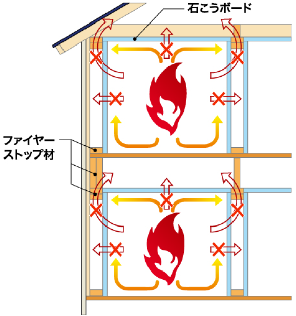 ファイヤーストップ構造火の通り道となる床や壁の内側において、枠組材などがファイヤーストップ材となって空気の流れを遮断し、上階へ火が燃え広がるのをくい止めます。