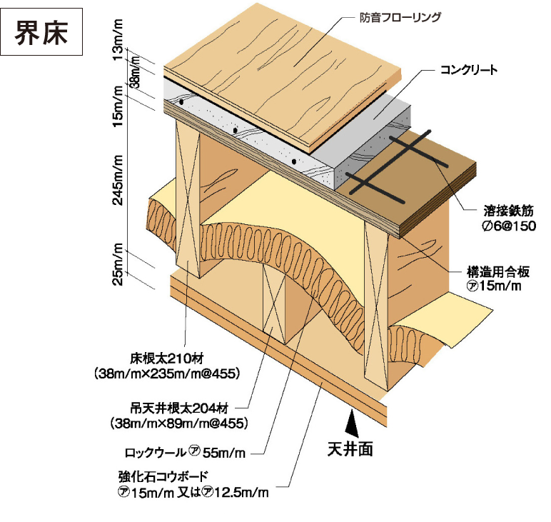 ケーティアイ建設工業では、さらなる防音対策として、床材には防音フローリング(LL-45等級)を使用し加えてコンクリートを流し込む施工を行っています。防音フローリングの衝撃吸収材による効果とコンクリートによる独自のダブル防音で、木造や鉄骨住宅で懸念されがちな遮音対策に取り組み、より快適な暮らしをお約束します。