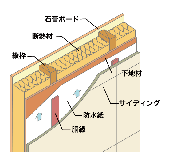 壁内には断熱材が充填され、結露が発生しにくい構造となっている他、断熱材の外側に通気層を設け、万一の漏水時の排水にも対応。小屋裏にも軒裏換気、棟換気等を設けるなどして有効な換気方式を採用しています。