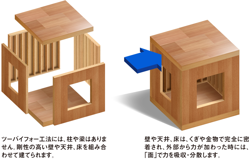 揺れへの強さを実証ツーバイフォー工法は、建物全体が4面の壁と、床・屋根で構成される6面のモノコック構造で建築されます。モノコック構造は車両などにも採用される堅牢な構造で、建物全体を一つの構造体とすることで外から受ける力を1点に集中させることなく、全体で力を吸収・分散するため、揺れや衝撃に対して強さを発揮し、建物の変形や倒壊などの被害を防ぎます。