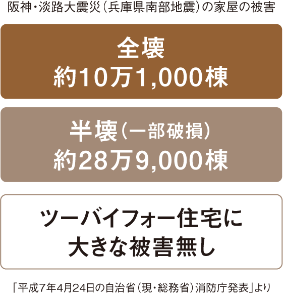 平成7年(1995年)1月17日午前5時46分、兵庫県南部を襲った阪神・淡路大震災(兵庫県南部地震)。大都市の直下で発生した地震(M7.3、震度7)であったために、想像をはるかに超えた大惨事となってしまいました。この地震による家屋の被害は、全壊約10万1,000棟、半壊を含めた一部損壊が約28万9,000棟以上(平成7年4月24日の自治省(現・総務省)消防庁発表より)。しかし、このような壊滅的な状況下でさえ、ツーバイフォー住宅に大きな被害はありませんでした。死者の約9割にあたる人が建物の倒壊による犠牲者といわれる阪神・淡路大震災。このデータからも住まいの耐震性がいかに大切であるかわかります。